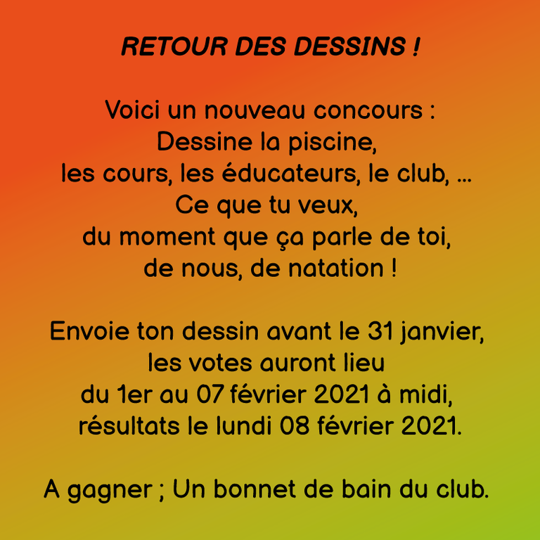 Envoie ton dessin avant le 31 janvier, les votes auront lieu du 01 février au 07 février 2021 à midi,résultats le lundi 08 février 2021.