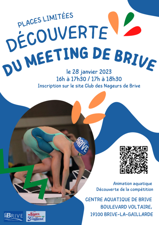 Le samedi 28 Janvier 2023 entre 16h et 18h30, une animation t'es proposée pour apprendre à connaître les différentes activités de la natation ainsi que le meeting national de la ville de brive. Water-polo, palmes, natation artistique et le parcours 100% gaillard !!