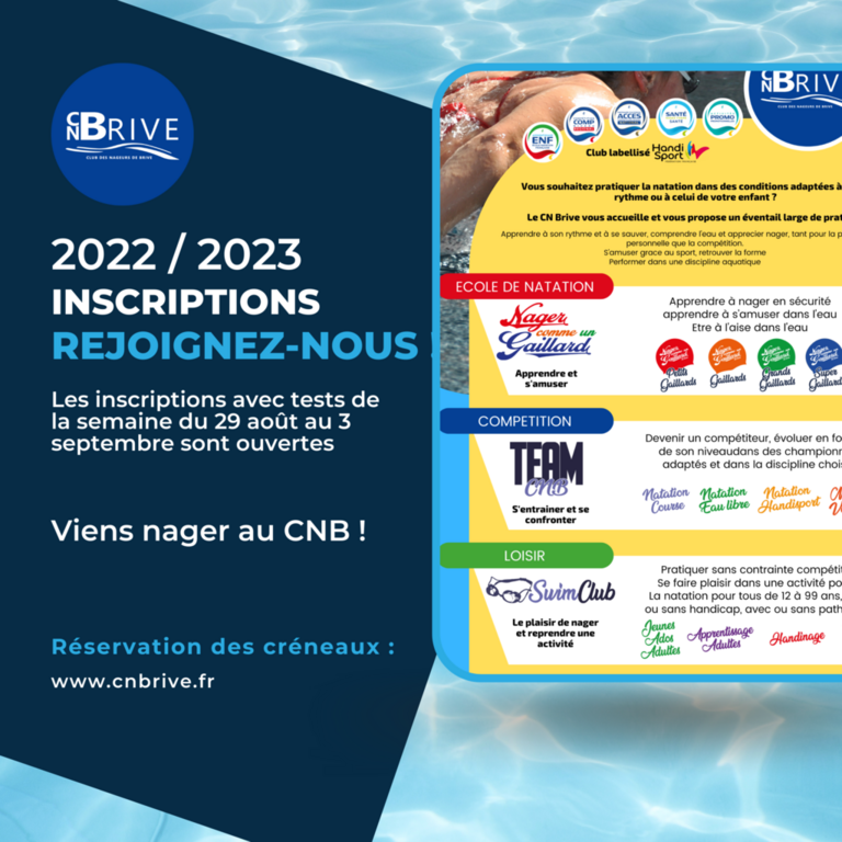 La semaine d'inscriptions avec tests du 29 août au 3 septembre est ouverte à la réservation. Nous rappelons que seuls les enfants ayant déjà un minimum de savoirs-faire on besoin d'un test. Ils auront lieu à la piscine de Brive.